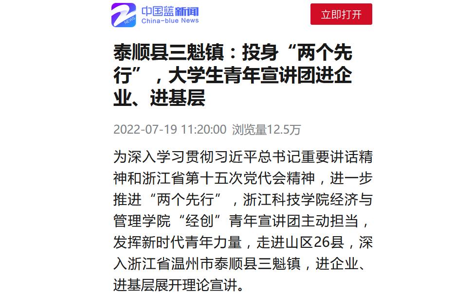特色活动 首页 学生工作 特色活动 正文 中国蓝新闻客户端、今日泰顺新闻客户端等媒体关注我院“经创”青年宣讲团 近日,我学院“经创”青年宣讲团走进山区26县,深入浙江省温州市泰顺县三魁镇,进企业、进基层,围绕省第十五次党代会精神展开宣讲,重点讲述“两个先行”、“8个经验”、“5大战略指引”、“11方面重要遵循”等内容。宣讲团受到中国蓝新闻客户端、今日泰顺新闻客户端等媒体关注。 中国蓝新闻客户端:泰顺县三魁镇:投身“两个先行”,大学生青年宣讲团进企业、进基层 今日泰顺新闻客户端:省第十五次党代会精神进企业|宣讲鼓劲促发展 企业聚力助共富