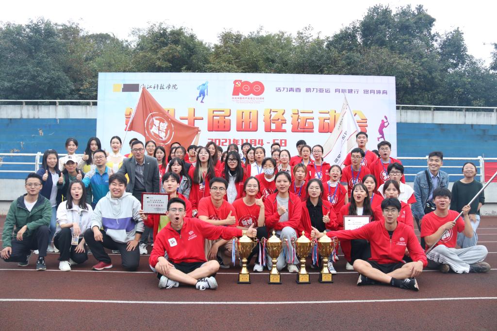 特色活动 首页 学生工作 特色活动 正文 【运动会】贺经管学院勇夺运动会九连冠 11月4日,浙江科技学院第四十届运动会正式开幕。经管学子在本次运动会上依然大展风采,在大部分项目中表现出色,共获得第一名8项,第二名15项,第三名4项,第四名4项,第五名4项,第六名2项,第七名7项,第八名8项的好成绩。于正阳同学以10.95s的成绩打破校男子100米记录,以22.49s的成绩打破校男子200米记录。 在经管学子的共同努力下,经管学院勇夺运动会九连冠!并且获得了学生团体、男女团体、女子团体、男子团体总分第一名,入场式创新奖,广播操二等奖!希望经管学院不骄不馁,再接再厉!