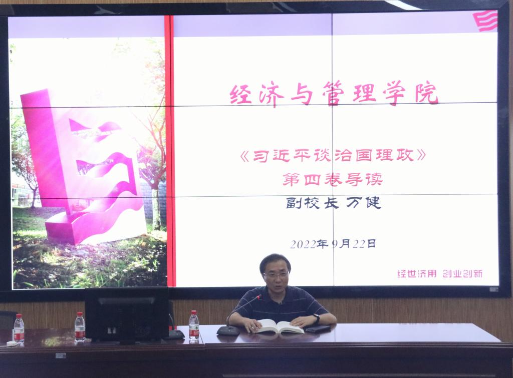 党建动态 首页 党建工作 党建动态 正文 经管学院开展《习近平谈治国理政》第四卷专题学习会 9月22日,经管学院召开《习近平谈治国理政》第四卷专题学习会,邀请副校长万健作专题报告,学院党委书记黎东升主持会议,系(部)负责人、党支部书记和全体行政教职工参会。 学习会上,万校长重点围绕《习近平谈治国理政》第四卷中不断做强做优做大我国数字经济的专题进行导学,运用大量实例和数据,全面深入剖析了对习近平总书记谈数字经济的学习心得体会,并对经管学院的学科建设给予了针对性的指导,对学院进一步把思想和行动统一到习近平新时代中国特色社会主义思想和习近平总书记重要讲话精神上具有重大引导作用。 学习会后,黎书记对于学院下一步学习工作强调以下四点:一要进一步深刻领会“两个确立”的决定性意义,坚决做到“两个维护”;二要进一步把学习《习近平谈治国理政》第四卷的成效转化到日常教学、科研及教学研究和数字经济等学科建设谋划之中,力争在新一轮学科点申报工作早谋划、早行动和早成功;三要进一步发挥党员教师的示范带动作用;四要进一步为党的二十大胜利召开营造良好的氛围。 下一步,各党支部和党员要以支部主题党日、个人自学等多种形式学习《习近平谈治国理政》第四卷,真正用党的创新理论武装头脑、指导实践、推动工作,在学懂弄通做实上下功夫,切实把学习成果转化为践行“八八战略”,投身“两个先行”,为学校“一培育两攻坚”重点工作目标作出经管学院的贡献。