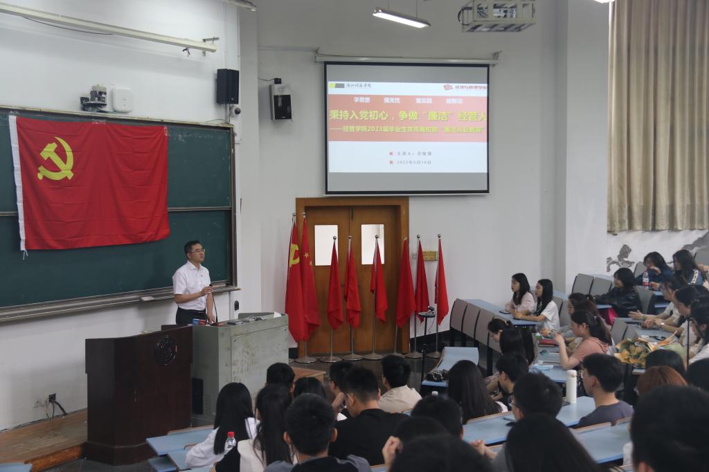 党建动态 首页 党建工作 党建动态 正文 【主题教育】经管学院开展廉洁教育系列活动 为深入学习宣传贯彻党的二十大精神,认真落实党中央《关于加强新时代廉洁文化建设的意见》,经管学院开展廉洁教育系列活动。 5月19日,经管学院党委副书记、纪委书记范俊强以“秉持入党初心,争做“廉洁”经管人”为题,为150名2023届毕业生党员做离校前“廉洁从业教育”。 5月26日,学院纪委开展纪检监察干部“圆桌会”学习沙龙暨主题教育学习会,学习纪检监察工作的相关文件,并讨论编写《中共浙江科技学院经济与管理学院纪委纪检监察工作文件汇编》和《浙江科技学院经济与管理学院反腐倡廉工作量表》,加强师生的廉洁教育。 5月26日,与蚂蚁集团联合开展金融知识进校园活动,争做金融“明白人”,筑牢经管人廉洁价值观。 6月初,学院以党支部为单位,下发学院纪委编制的《反腐倡廉工作量表》,并回收评阅存档,提高师生廉洁教育的针对性。 6月9日,学院领导班子成员赴廉洁文化教育基地-余杭“四无粮仓”陈列馆现场学习,进一步强化党性修养,加强廉洁自律意识,推动廉洁建设走深走实。 x