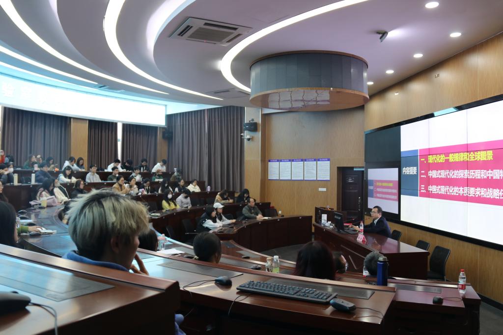 党建动态 首页 党建工作 党建动态 正文 中共中央党校邹一南教授为经管学院师生作专题报告 11月27日,中共中央党校(国家行政学院)经济学教研部邹一南教授做“学习习近平总书记关于中国式现代化重要论述”的专题报告。学院师生代表和第四十一期党校学员参加,由学院党委副书记范俊强主持。 邹一南教授围绕现代化的一般规律和全球图景、中国式现代化的探索历程和中国特色,以及中国式现代化的本质要求和战略任务进行全面阐述和解读。邹教授深入浅出的报告进一步加深了经管师生对中国式现代化的认识,鼓舞师生在深入学习中切实感悟思想伟力、汲取奋进力量、增强能力本领,为全面建成社会主义现代化强国贡献力量。 范俊强希望学院师生以本次辅导报告为契机,更加坚持不懈用习近平新时代中国特色社会主义思想凝心铸魂,更加深刻理解中国式现代化的深刻内涵,争做党的创新理论的坚定信仰者、忠实践行者、积极传播者。