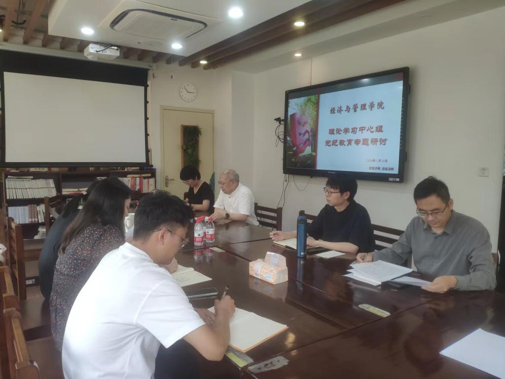 党建动态 首页 党建工作 党建动态 正文 经管学院党委理论学习中心组召开党纪专题学习会 5月20日,经管学院党委理论学习中心组召开党纪专题学习会。重点围绕修订后的《中国共产党纪律处分条例》开展学习研讨。学院党委理论学习中心组成员参加会议,院长董颖、本科生支部书记李寒滇、研究生支部书记杨菲列席参加会议。 会议强调,牢牢把握党纪学习教育的总要求,坚持学思用贯通,不断增强政治定力、纪律定力、道德定力,为高等教育事业高质量发展提供坚强纪律保障。要用深悟践行推动党纪教育。一是原原本本学习《条例》,逐章逐条学习研讨。二是坚持严管厚爱结合,班子成员间、班子成员与普通党员、班子成员与党外知识分子谈心谈话全覆盖,及时进行个别廉政提醒。三是召开警示教育会,注重用身边人身边事开展警示教育,让党员、干部、教师受警醒、明底线、知敬畏。四是结合学院工作实践,制作廉政风险防控清单,识别岗位风险点、评估风险等级、制定防控措施、落实防控责任、定期评估和调整。 会上,与会成员结合自身工作实际,交流学习体会。