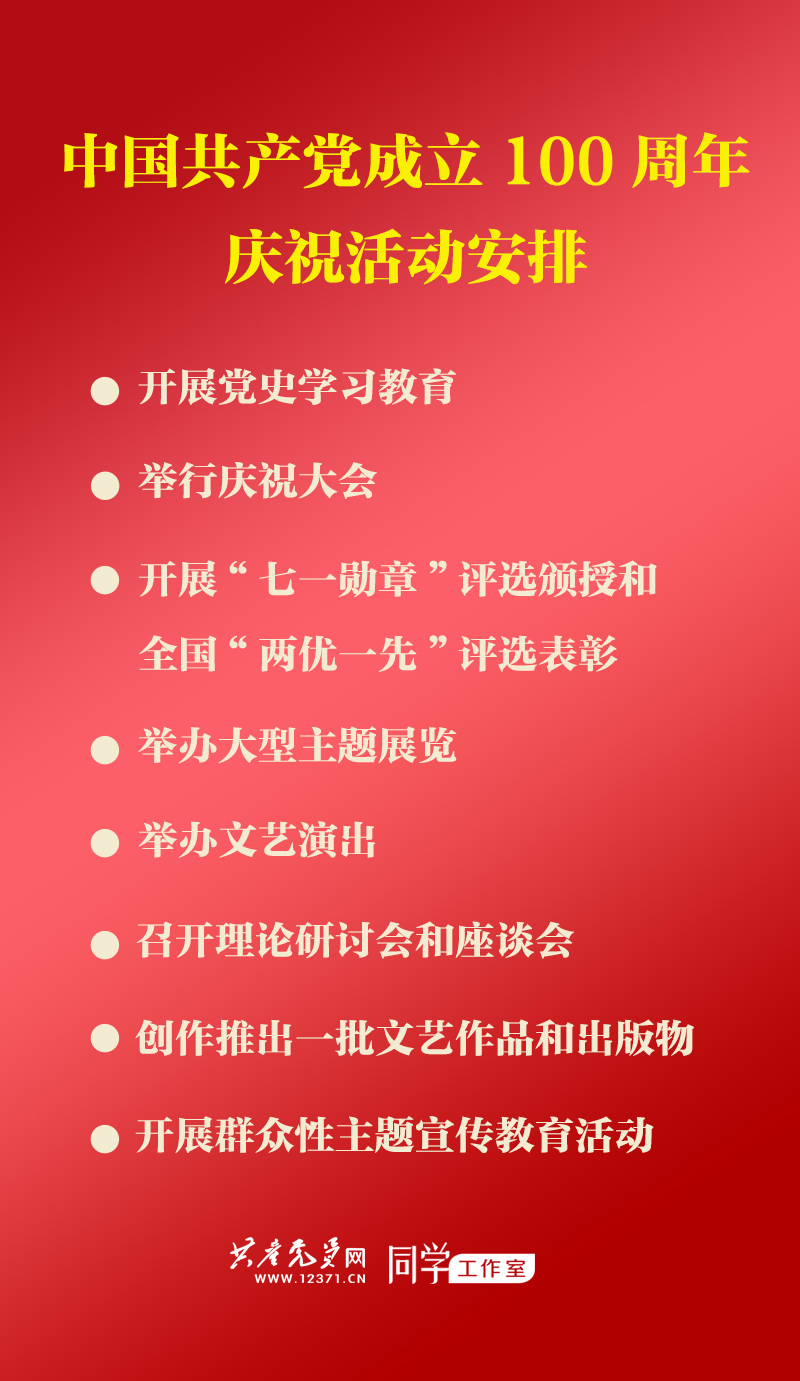 六是召开理论研讨会和座谈会。中央宣传部将会同中央组织部、中央党校(国家行政学院)、中央党史和文献研究院、教育部、中国社会科学院、军委政治工作部联合召开庆祝建党100周年理论研讨会;中央组织部将召开全国优秀共产党员、优秀党务工作者、先进基层党组织代表庆祝建党100周年座谈会,还要召开老党员老干部座谈会和党的建设历史经验研讨会;中央统战部将商各民主党派中央、无党派人士和全国工商联,召开各界人士庆祝中国共产党成立100周年座谈会。