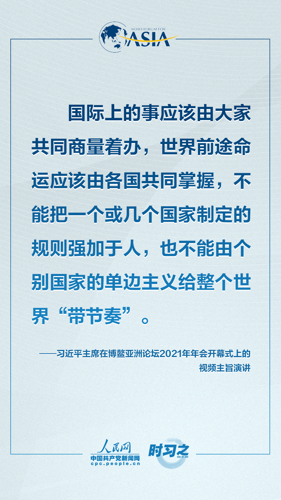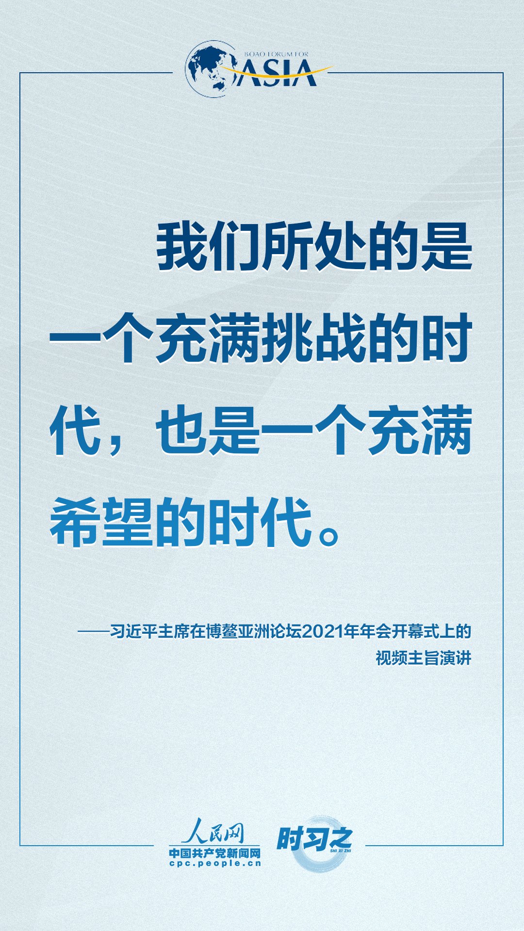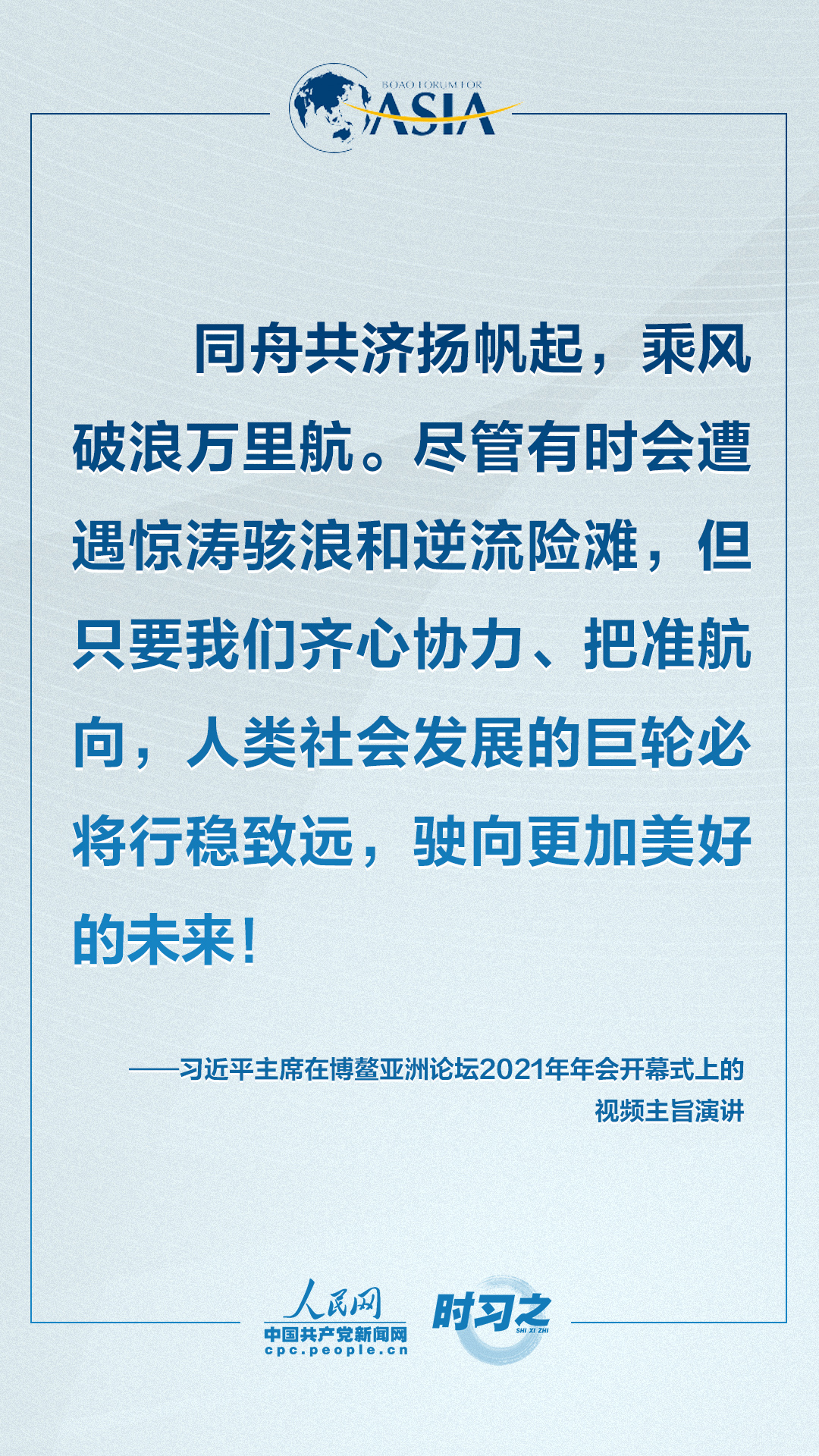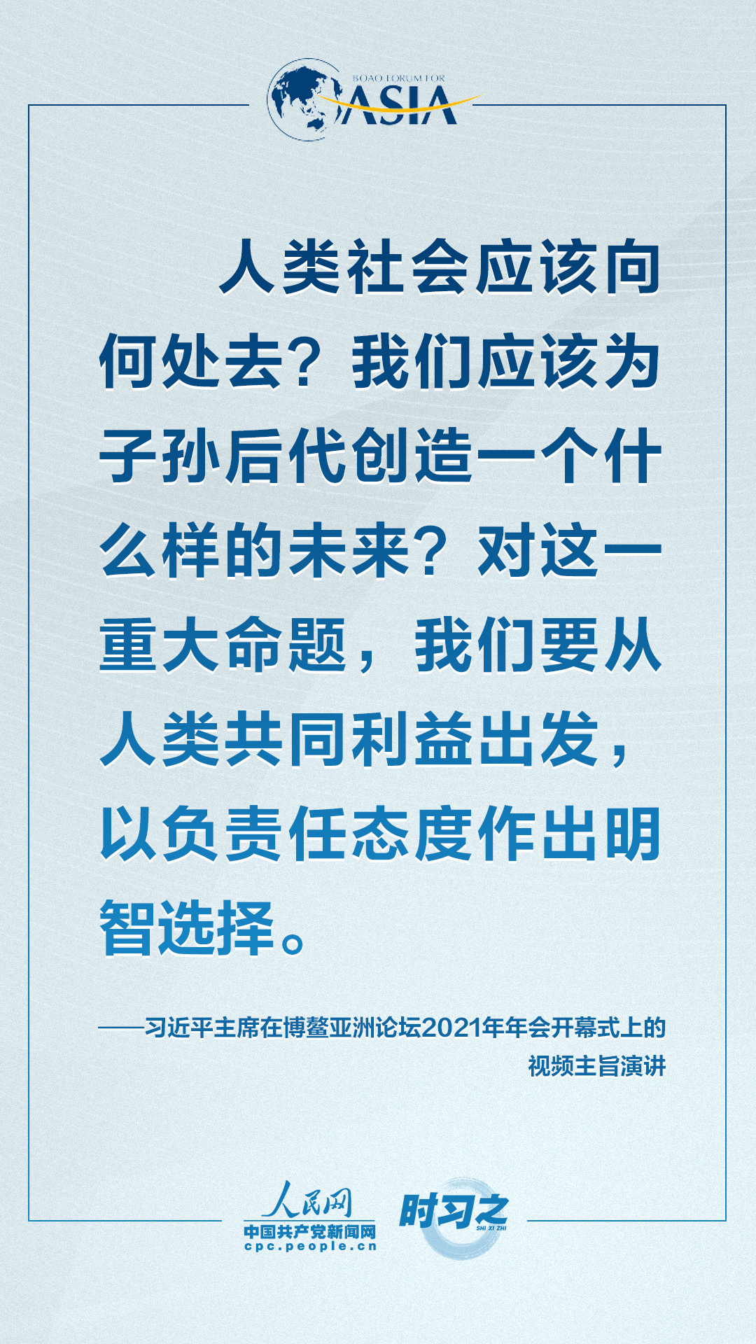理论学习 首页 党建工作 理论学习 正文 共克时艰共创未来 习近平这样对世界说 4月20日上午,博鳌亚洲论坛2021年年会开幕式在海南博鳌举行,国家主席习近平以视频方式发表题为《同舟共济克时艰,命运与共创未来》的主旨演讲。面对“人类社会应该向何处去?我们应该为子孙后代创造一个什么样的未来?”的重大命题,习近平这样对世界说。