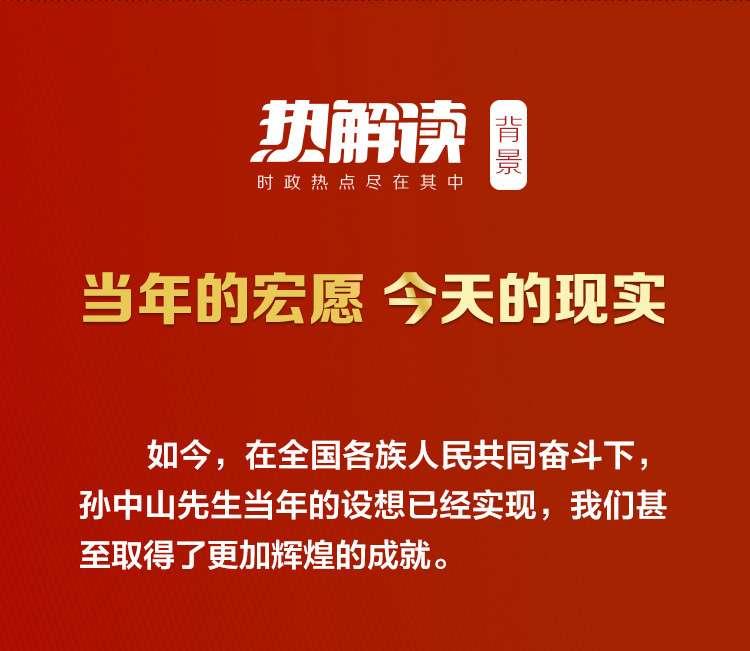 “祖国大地上,铁路进青藏,公路密成网,高峡出平湖,港口连五洋,产业门类齐,稻麦遍地香,神舟遨太空,国防更坚强。”抚今追昔,习近平总书记动情地说,中国人民创造的许多成就远远超出了孙中山先生的设想。