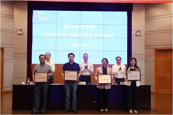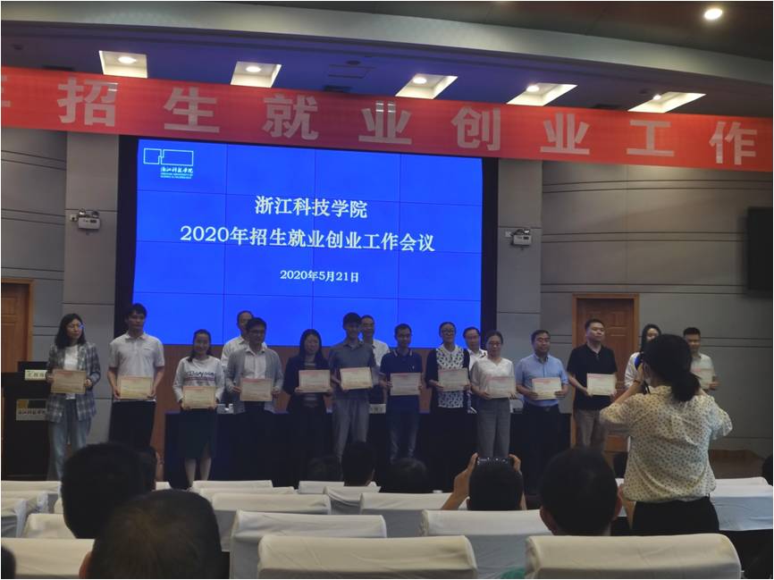 校党委副书记周加敏宣读《浙江科技学院关于表彰2019年毕业生就业工作先进集体和先进个人的通报》。校领导为获表彰的集体和个人代表颁奖。我院荣获2019年校就业工作“先进集体”荣誉称号及“就业贡献奖”;张华勇、叶俊焘、程芳芳、徐晓秋、彭鸿广、荣珏、汪祥富、李月宁等8名教师被评为校就业工作先进个人。
