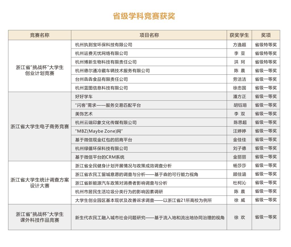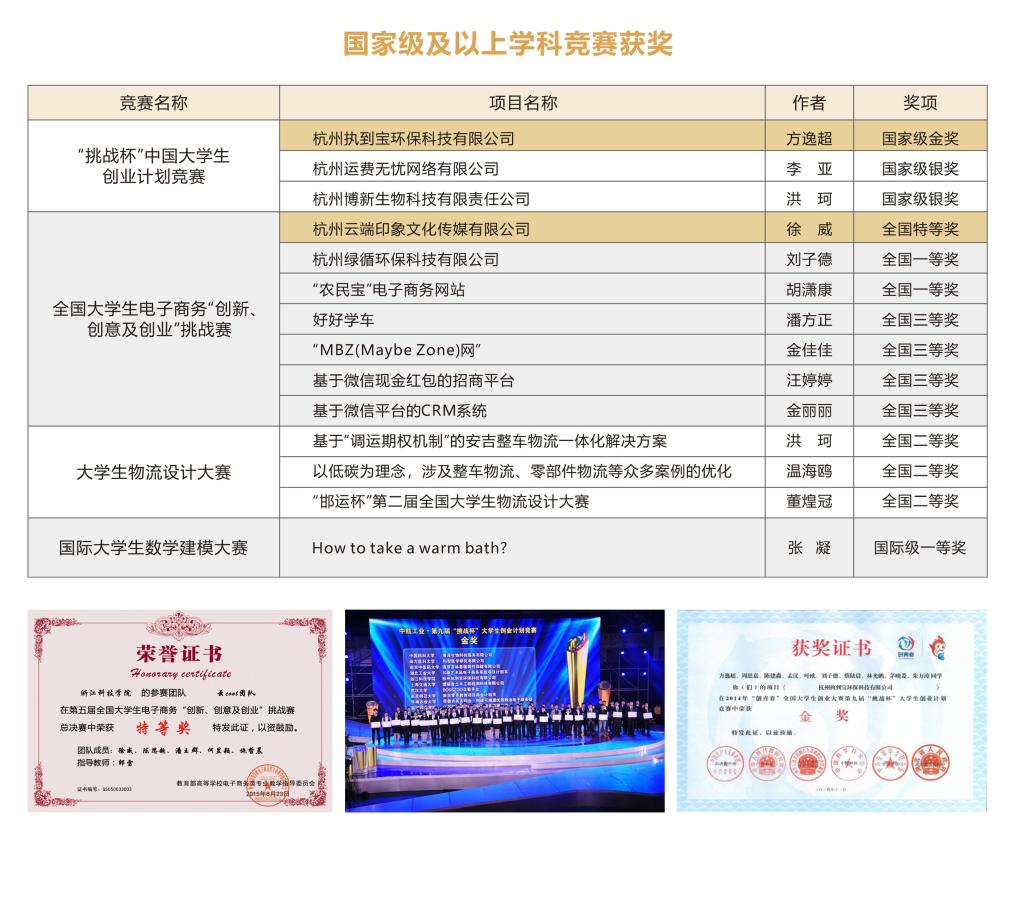 近年来,经管学生先后获得国际大学生数学建模大赛一等奖1项,“挑战杯”大学生创业计划竞赛国家金奖1项(实现了我校全国“挑战杯”大学生创业大赛金奖零的突破)、银奖2项、省特等奖3项、省一等奖4项、省二等奖15项、省三等奖19项,全国大学生电子商务“创新、创意及创业”挑战赛特等奖1项(是我校A类学科竞赛所获得的第一个全国特得奖)、一等奖2项、三等奖3项等一系列奖项,同时在其他各级各类竞赛中斩获佳绩。