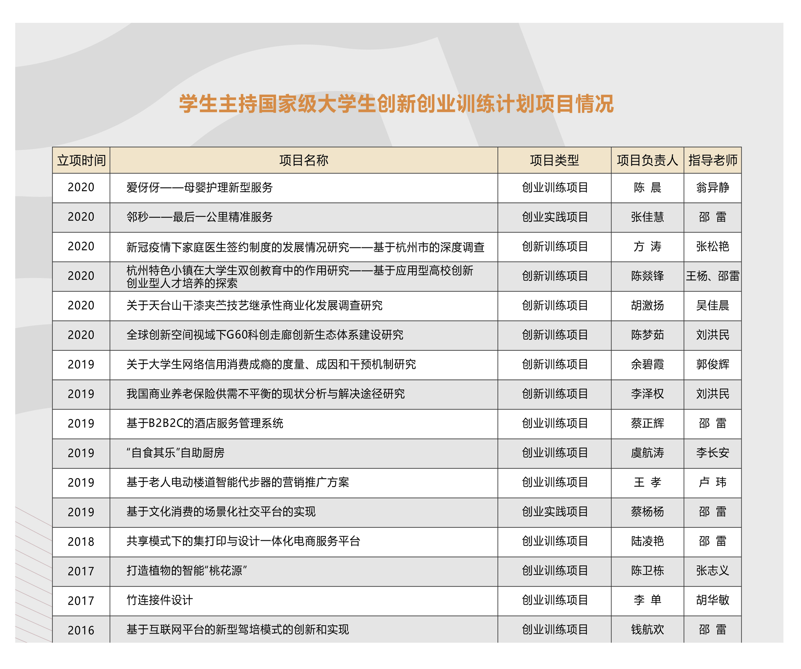 学院十分重视对学生创新精神、创业能力和创造意识的培养,近5年来,学生主持国家级创新创业训练计划项目16项、主持省级浙江省大学生科技创新活动计划暨新苗人才计划18项、主持校级大学生课外科技创新与实践项目195项。