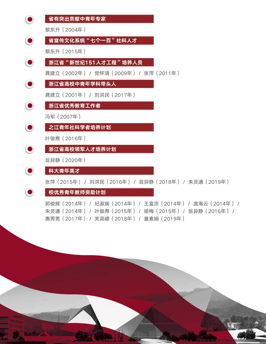 学院现有教职工110余人,其中专任教师90余人,教师中正高12人、副高34人,博士60余人,具有海外留学、进修的教师30余人。专业教师高级职称比例达53%,博士比例达64%,硕士及以上比例达94%;有省突出贡献中青年专家1人,省宣传文化系统“七个一百”社科人才1人,省“151人才工程”培养人员3人,浙江省高校中青年学科带头人2人,浙江省优秀教育工作者1人,之江青年社科学者培养计划1人,科大青年英才4人,校优秀青年教师资助计划11人。学院还聘请了50余位国内外相关专业或行业的知名学者、企业家、企业高层管理人员等作为学院的兼职或客座教授。