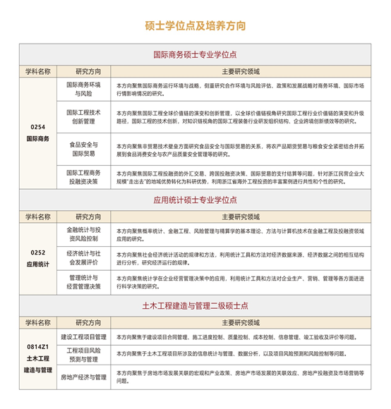 学院目前拥有“国际商务”、“应用统计”2个专业学位硕士点,“土木工程建造与管理”二级学科学术硕士学位点。
