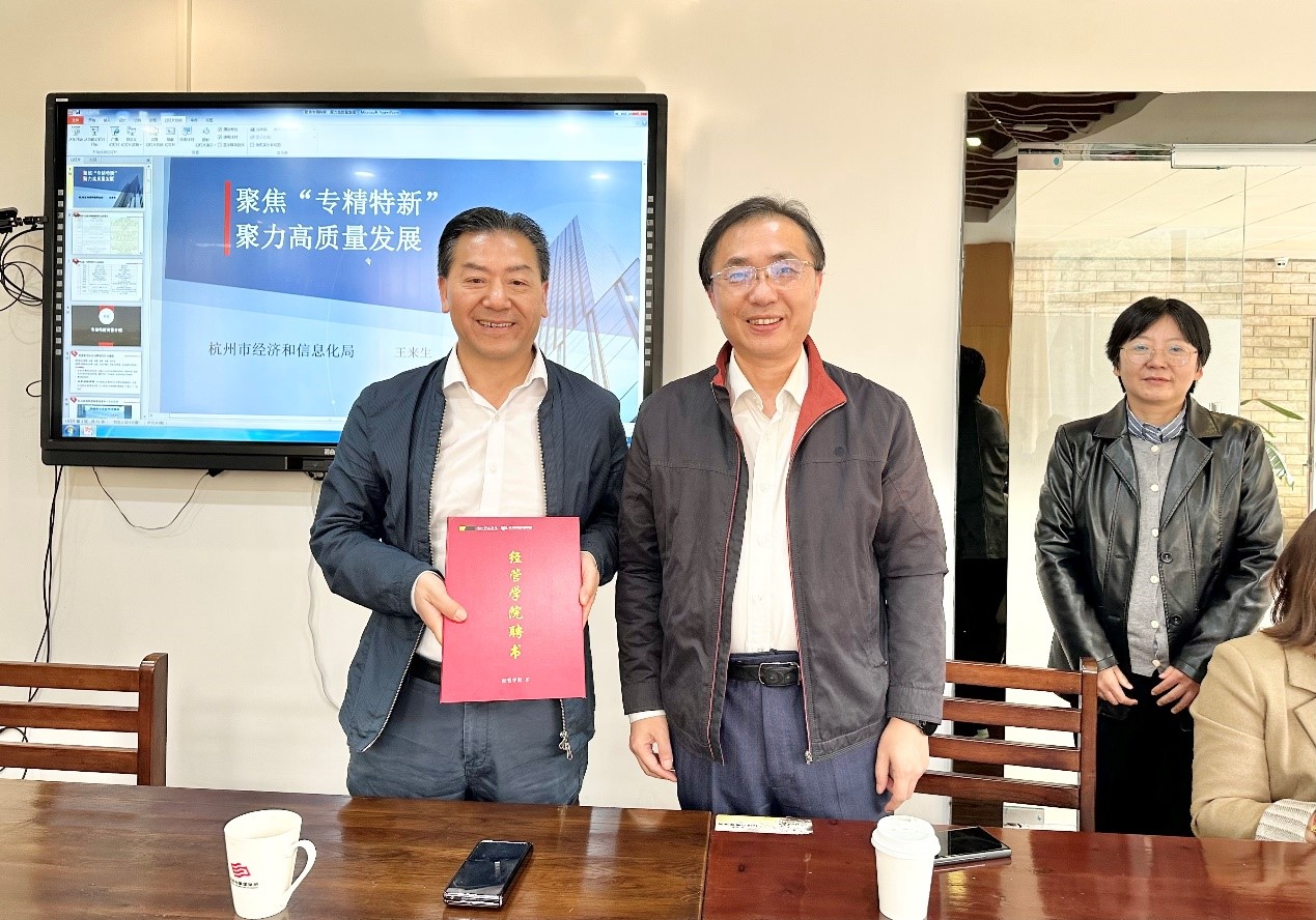 董颖介绍了王来生导师的工作经历,万校长代表学校讲话并为杭州市经济和信息化局企业服务体系建设处王来生处长颁发证书,王处长表示,将助力我院人才队伍、团队和学科平台建设,尽全力为学院发展贡献个人力量。