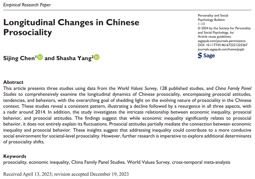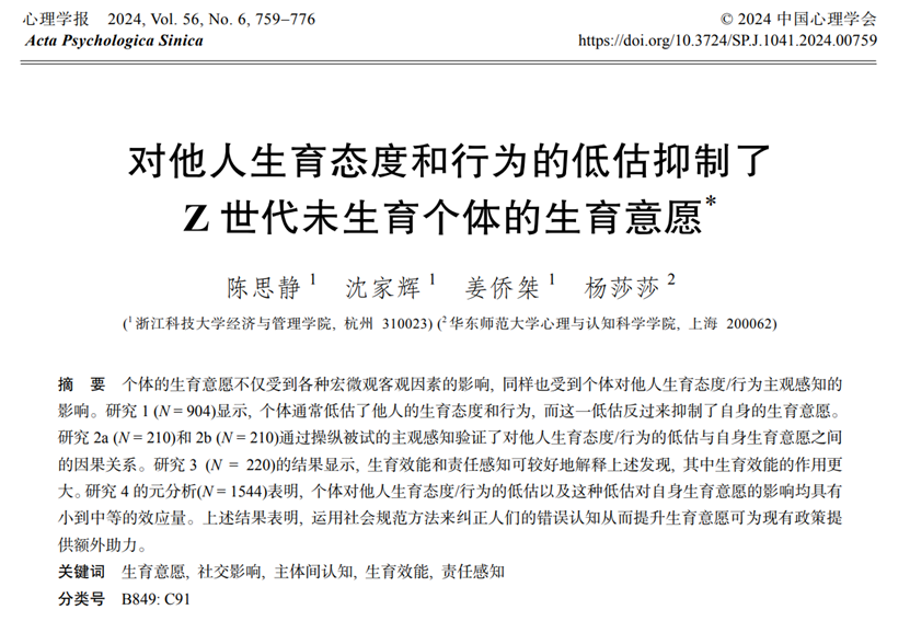 近日,浙江科技大学经济与管理学院陈思静副教授在《心理学报》和Personality and Social Psychology Bulletin分别以第一作者身份发表了题为“对他人生育态度和行为的低估抑制了Z世代未生育个体的生育意愿”和“Longitudinal Changes in Chinese Prosociality”的论文。近年来,陈思静副教授团队围绕“群体行为与社会治理”主题开展系列研究,研究内容包括绿色行为、生育行为、合作行为、亲社会行为等。自2020年以来,在《心理学报》发表论文6篇、在Personality and Social Psychology Bulletin发表论文1篇、在Journal of Environmental Psychology发表论文2篇,上述论文中浙江科技大学均为第一单位。