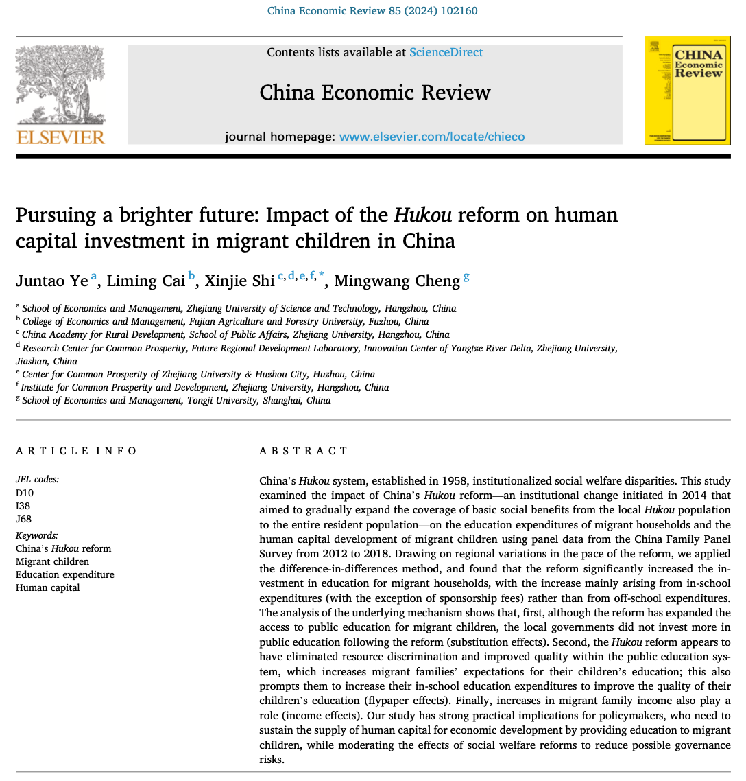 近日,学院应用经济学团队研究成果“Pursuing a brighter future: Impact of the Hukou reform on human capital investment in migrant children in China”(论文链接https://doi-org-443.webvpn.zust.edu.cn/10.1016/j.chieco.2024.102160)在国际权威期刊《China Economic Review》(中国科学院经济学一区,Top期刊,IF=6.8)上发表,该论文由浙江科技大学经济与管理学院叶俊焘教授联合浙江大学公共管理学院史新杰研究员,同济大学经济与管理学院程名望教授,福建农林大学博士生蔡丽明(原我校应用统计专业硕士研究生)共同完成,叶俊焘教授为第一作者,浙江科技大学为第一单位。