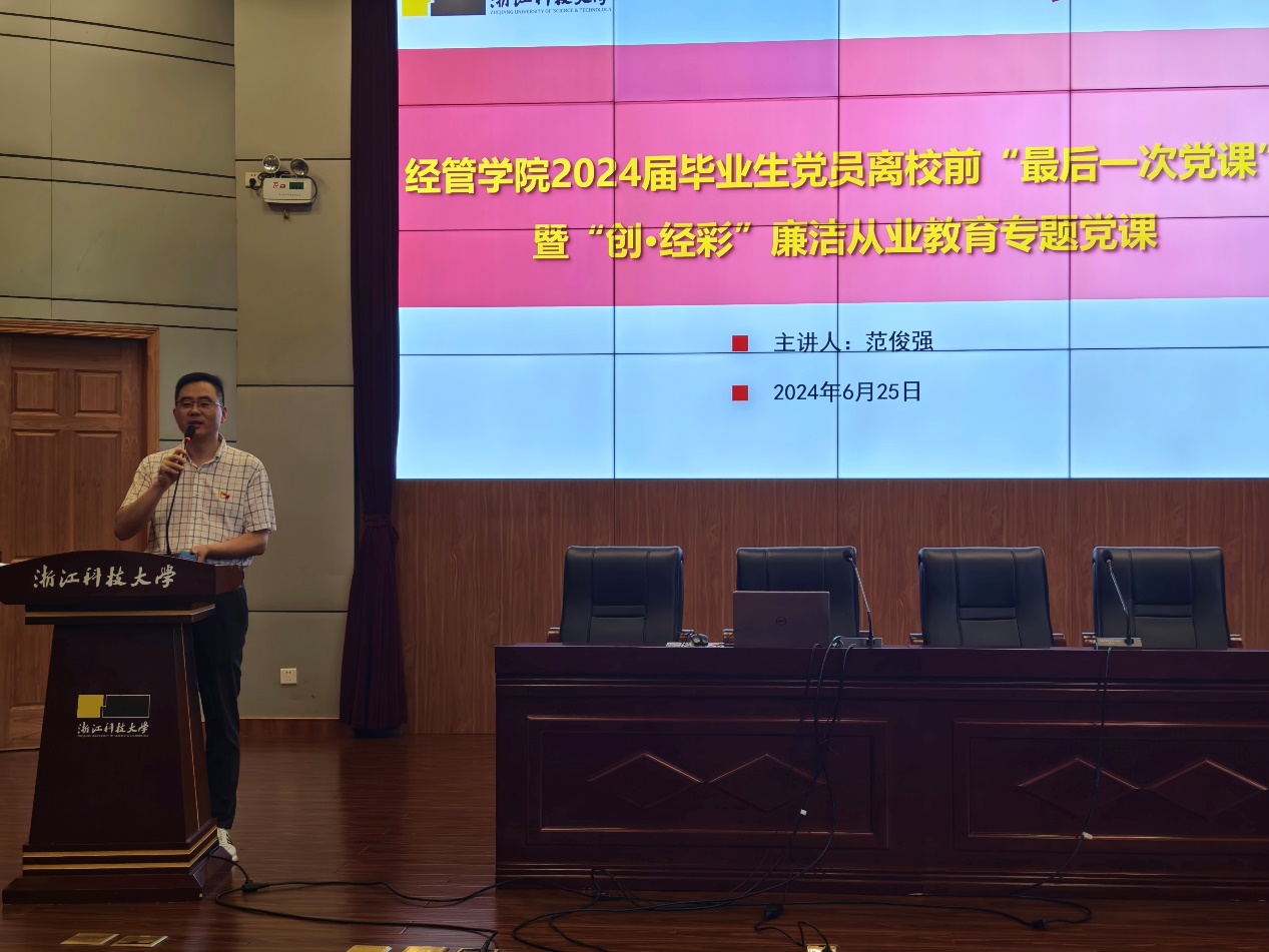 范俊强围绕当前经济态势,重点围绕我国经济高质量发展取得的新成效,经济发展面临的新变化新挑战和党中央关于经济发展的重大决策部署,帮助广大毕业生党员清楚认识当前经济态势,积极调整心态,主动迎接挑战。课上,范俊强还介绍了学院在考研升学、就业工作、亚运会志愿服务、卓越学子、年度人物等方面取得的突出成绩。同时,范俊强勉励毕业生要牢守廉洁从业的底线,作为党员同志,要紧绷内心的一根弦,提高自身要求,舍小家顾大家,不计较个人的得失。保持积极乐观的心态,接续奋斗,养成终身学习的习惯,在将来的工作和学习岗位上勇争先锋,展现经管校友的时代担当和良好风貌。