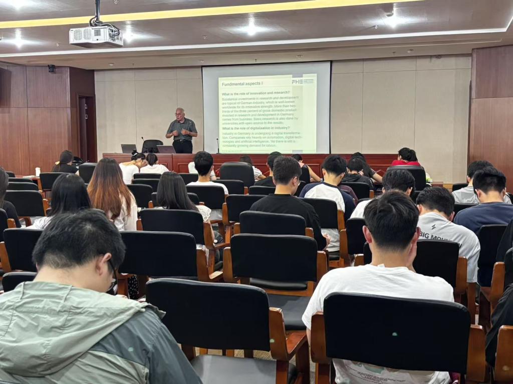科尔教授首先向管理学院和经济学院的师生介绍了德国和欧盟经济社会发展的基本情况,和德国大学商科领域的教育教学,尤其是德国高校较为重视的双元制教育和企业实践。在此次系列讲座中,科尔教授就德国的人工智能发展,企业管理实践,交通运输、工业和服务业发展的现状,可持续发展目标的执行状况,以及当下国际政经关系对德国的影响与应对等主题,和师生展开交流。