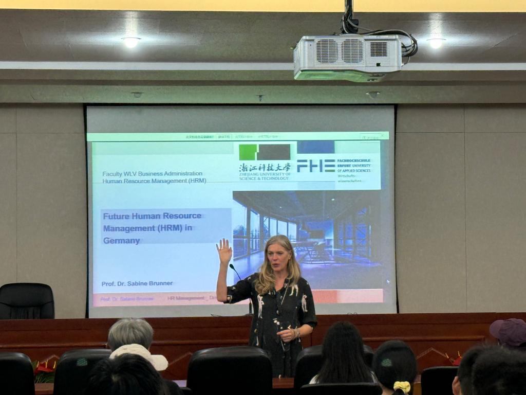 10月16日-19日,在中德合作40周年活动期间,德国埃尔福特应用科学大学人力资源管理教授萨宾•布鲁纳(Sabine Brunner)和交通经济学教授弗洛里安•海尼茨(Florian Heinitz)、德国西萨克森茨维考应用科学大学教授克里斯蒂安-安德烈亚斯•舒曼(Christian-Andreas Schumann)、罗马尼亚克鲁日巴比什-博雅依大学副校长克里斯蒂安•萨卡雷亚教授(Christian Sacarea)来访我院,双方就进一步深化学位合作、学术交流和师生互访进行会谈。其中埃尔福特应用科学大学人力资源管理教授萨宾•布鲁纳为安吉校区师生带来了题为“德国未来的人力资源管理”的学术讲座。