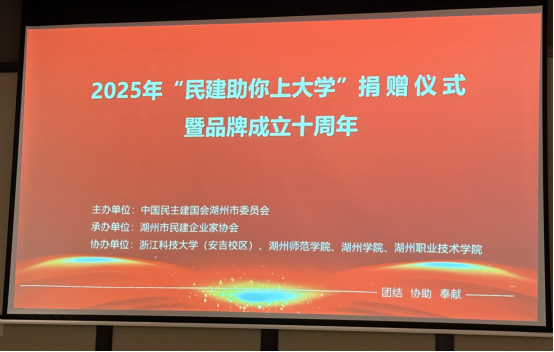11月9日,2025年“民建助你上大学”捐赠仪式暨品牌成立十周年活动在湖州西塞山鸿居酒店顺利举办。湖州市副市长、民建湖州市委会主委金凯出席本次活动。管理学院院长董颖、学工办主任李寒滇、湖州市慈善总会、民建市委会、企业家协会相关负责人一同参加。