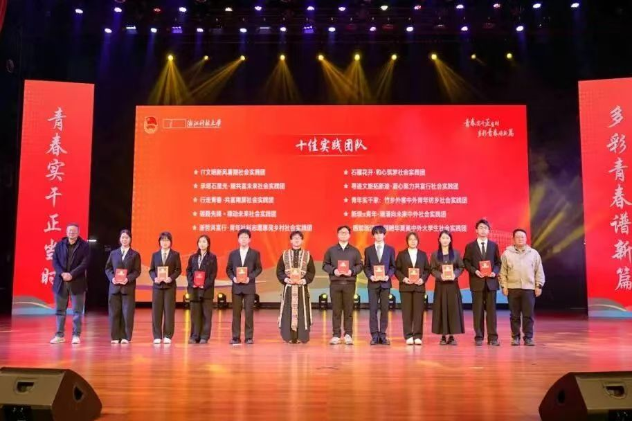 2025年11月27日,浙江科技大学“真理的味道” 思政育人实践成果展示会暨卓越领航青马学院开班仪式圆满举行。管理学院“寻迹文旅拓新途,凝心聚力共富行”暑期社会实践团凭借特色鲜明的实践路径、成果丰硕的育人实效,在全校122支参赛团队中崭露头角,成功斩获校“十佳实践团队”荣誉,指导老师高淑慧获评 “优秀指导教师”。